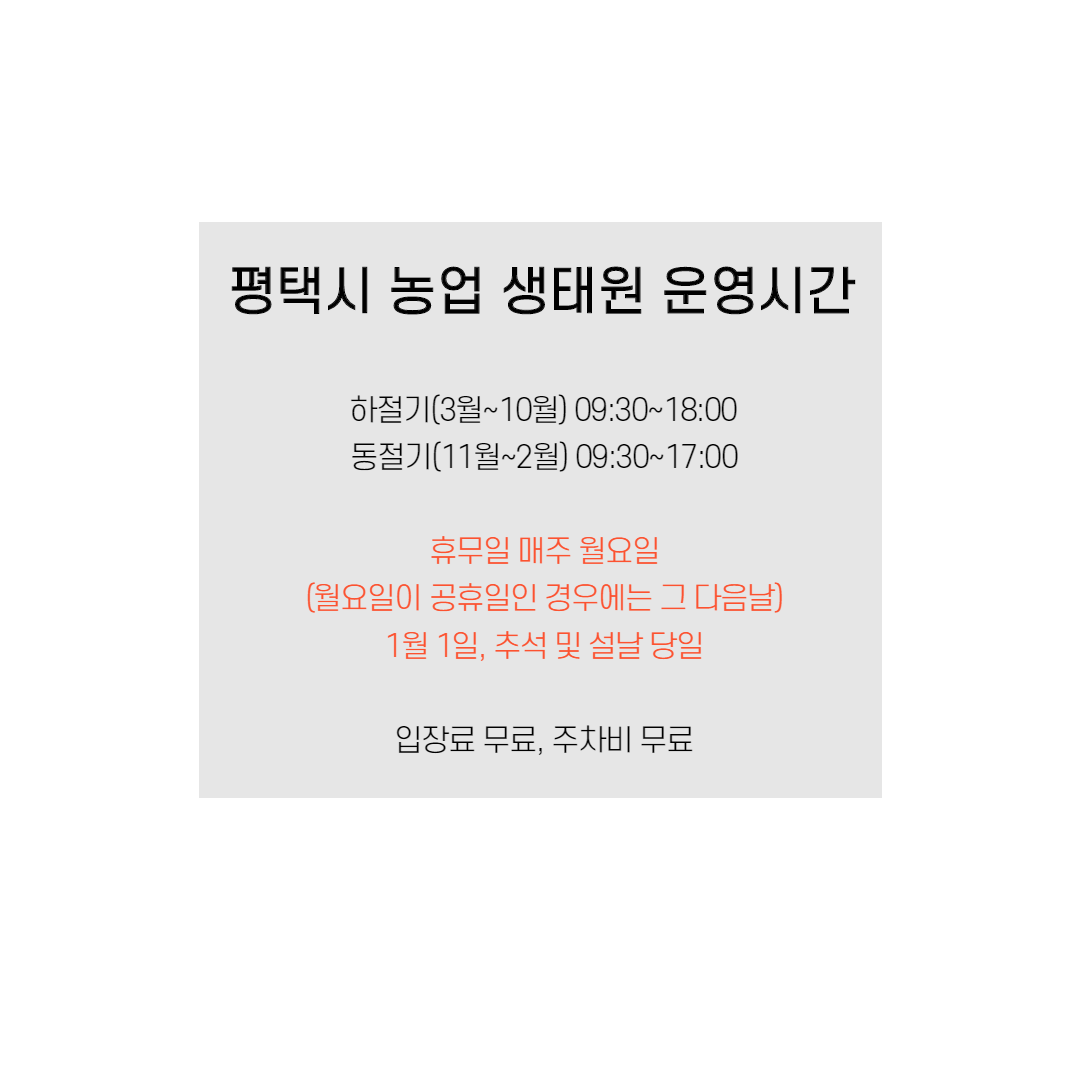 오늘은 평택시 농업생태원을 소개한다. 경기도 평택시 오성면에 위치한 평택시 농업생태원은 2018년 10월에 개장하여 114.654㎡ 면적에 농업·농촌 볼거리 외에 어린이 놀이터, 펫 놀이터 등 다양한 시설과 꽃 축제, 농촌문화체험, 농업교육, 텃밭 등 다양한 체험을 진행하며 사람들에게 휴식처가 되고 있다. 가을을 맞아 국화꽃 향기로 가득한 평택시 농업생태원을 둘러보자. 평택시 농업생태원에 도착하면 큰 건물의 안내소와 방문자센터가 먼저 눈에 띈다. 안내소에는 안내책자와 미아방지 팔찌가 비치되어 있고, 방문자센터 안에는 여러 가지 정보와 휴게시설, 화장실이 있다.
