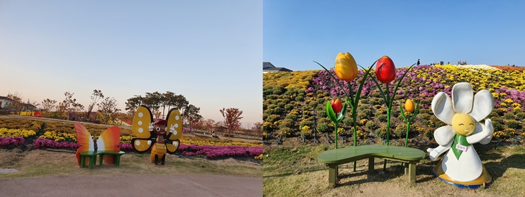 [어울마당 야외무대_조석현 기자] 오른쪽으로는 바람원(꽃의 정원)이 있었다. 가을을 맞아 국화꽃들이 가득하고 매우 아름다웠다. ![]() [상징 조형물_조석현 기자] 광장 가운데는 상징 조형물과 하트 조형물이 예쁘게 있어 포토존으로 인기 좋았다. 내음달(꽃의 언덕)에는 형형색색의 국화들로 꾸며져 있었고, 높은 나무계단을 따라 정상에 오르면 농업생태원 전체를 한눈에 볼 수 있었다.정상은 사면 미끄럼틀과 연결되어 있었고, 사면 미끄럼틀은 규모가 상당히 컸다.