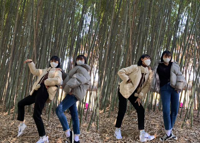 [대나무 숲에서 신난 단원들] 지나가던 사람들에게 대나무 숲이 예쁘다는 정보를 얻어 설레는 마음으로 대나무 숲으로 향하였습니다. 도심 속에서는 볼 수 없었던 아주 긴 대나무가 빽빽하게 자리 잡고 있어 정말 깊은 숲속으로 온 느낌이었습니다. 수목원에서의 즐거운 관람을 끝내고 맛있는 점심을 먹은 후, 도자기를 만들기 위해 <담쟁이도자기공방>으로 향하였습니다.