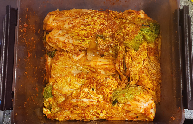 준비 과정이 끝났네요! 이제 김치를 무칩니다!! 생각보다 김치 만드는 과정은 아주 복잡하답니다. 짜잔!! 몸에 좋고 맛도 좋은 배추김치 완성되었습니다.