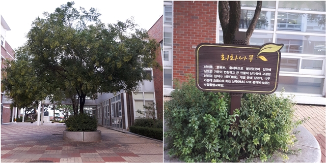 [교내 중심부에 있는 회화나무_이예린 기자] 회화나무는 우리나라 5대 거목 중 하나입니다. 8월 초에 피는 황백색 꽃은 황색 염료로 열매는 살충제로 쓰입니다. 커다란 나무에 주렁주렁 열린 많고 작은 열매들이 의미 없어 보였지만 우리 삶 속에서 여러 도움을 주고 있었습니다. 이름표가 있어 나무의 이름을 알고 선조의 지혜를 배울 수 있었지만, 교내의 다른 나무에는 볼 수 없었습니다. 그래서 문경여고 숲사랑청소년단은 지난 11월 25일, 향나무, 소나무, 배롱나무, 은행나무, 석류나무 등을 조사하고 이름표를 걸어주었습니다.