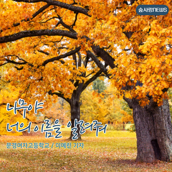 [배롱나무, 은행나무, 석류나무_이예린 기자] 마지막으로 자습실 가는 길에 있는 배롱나무, 은행나무, 석류나무입니다.나무껍질을 손으로 긁으면 잎이 움직인다고 하여 간지럼 나무라고도 불리는 배롱나무는 7~9월 가지 끝에서 붉은 꽃이 핍니다. 꽃은 혈액순환을 활발히 해주며 한방에서 설사 약재로 쓰입니다. 은행나무는 은행 열매가 살구와 비슷하여 은빛 살구의 뜻인 은행이라고 불리며 살아 있는 화석 식물입니다. 5월에 꽃이 피고 10월에 열매가 익습니다. 용문사의 은행나무는 한국에서 가장 오래된 나무로 천연기념물로 지정됐습니다. 마지막으로 석류나무는 11월임에도 작은 열매 하나가 가지 끝에서 버티고 있었습니다. 이 열매는 1830년대 연지로 사용되었습니다. 또 조선시대 의서에는 석류 뿌리가 회충을 잡아주는 역할을 했다고 합니다. 함께 이름표를 만들고 걸어준 숲사랑대원은 이번 활동을 통해 ‘문경여고 재학생 및 산책하시는 어르신들이 팻말을 보며 나무에 더 관심을 기울이고 정보를 얻는 것에 보람찼으며 앞으로 나뭇잎과 열매를 자세히 관찰해보는 계기가 되었으면 좋겠다’라는 활동 소감을 말해주었습니다. 우리 주변의 나무가 그저 지나쳐가는 한 그루일지라도 관찰하고 알아보고 언젠가는 심는 사람이 돼보는 건 어떨까요?