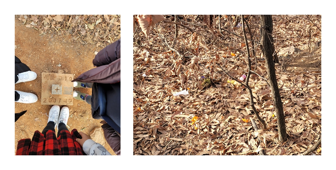 그렇게 정상을 찍고 내려오는 길에 거의 다 내려와 빌라들이 보이니 점점 더 쓰레기들이 많아진다는 것을 알 수 있었습니다. 그리고 사람이 많이 다니지 않는 인적이 드문 길일수록 더 쓰레기들이 많았습니다. 사람들이 많이 다니면 주위의 시선에 쓰레기 버리기 어려운데 아무도 안 보는 곳에서 자기의 양심을 버리기가 쉬웠나 봅니다.