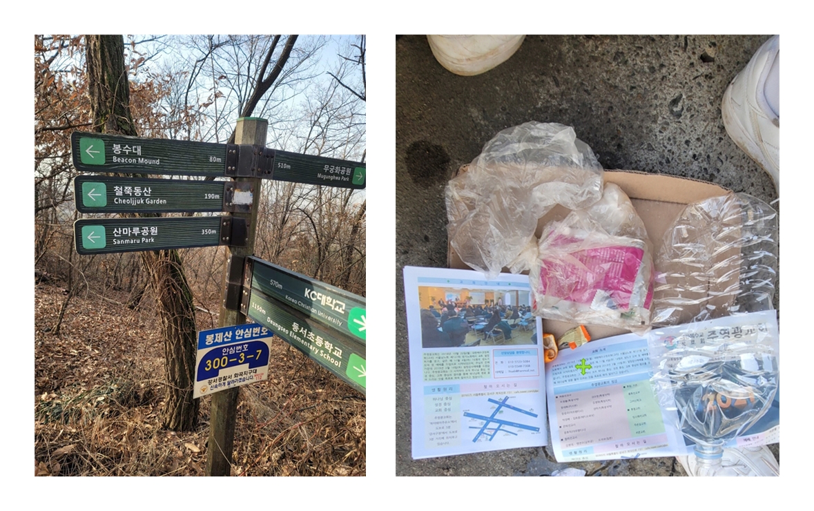 그렇게 좀 걷다 보니 보물들이(쓰레기들이) 나오기 시작했습니다. 처음에는 사탕 봉지, 비닐조각들로 시작해서 생수 페트병, 간식으로 가져온 과일조각들까지 많은 쓰레기들이 나왔습니다 정상에 도착하니 멋진 전망대와 삼각점까지 멋지게 펼쳐져 있었지만 속상할 정도로 많은 양의 쓰레기가 전망대 낭떠러지에 있었습니다. 너무 줍고 싶었지만 막혀있어서 줍지도 못하고 많이 속상했습니다. [줍지도 못할 곳에 제발 쓰레기 버리지 맙시다~~!]