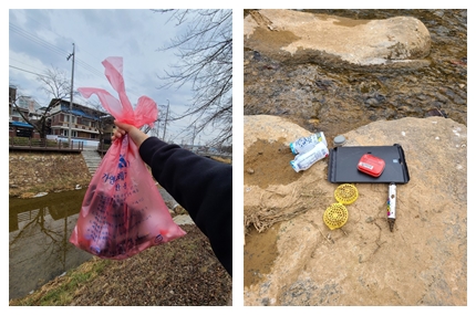 [모전천에 버려진 쓰레기_이예린 기자] 위 사진은 현장에 나갔을 때 찍은 사진입니다. 보시다시피 ‘주워야겠다’라는 마음이 강하게 들었습니다. 그리고 이 마음을 곧바로 행동으로 옮겼습니다. 포장된 길이 아니라 제대로 뛸 수는 없지만 걸으면서 앞서 소개해 드렸던 플로깅을 통해 쓰레기를 주워 보았습니다.