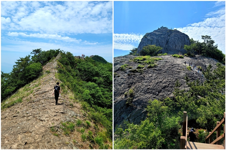 지리망산의 경우, 미륵산 보다는 난이도가 높은 산이다. 철계단과 밧줄, 그리고 가파른 경사로 인해 뒤를 돌아보면 낭떠러지일 정도로 무섭다. 그렇지만 탁 트인 조망은 그야말로 최고이고, 옥녀봉 부근에는 봉우리와 봉우리를 잇는 출렁다리도 있어 등산객에게 소중한 경험을 주는 산이다.