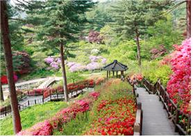 이 사진은 고향집정원이라는 테마정원이다. 마음 속 고향의 모습을 재현한 곳으로 정겨운 초가집과 진달래, 목련, 매발톱, 채송화 등을 볼 수 있다. 고향집정원의 풍경은 우리 고향의 모습을 느끼게 한다.