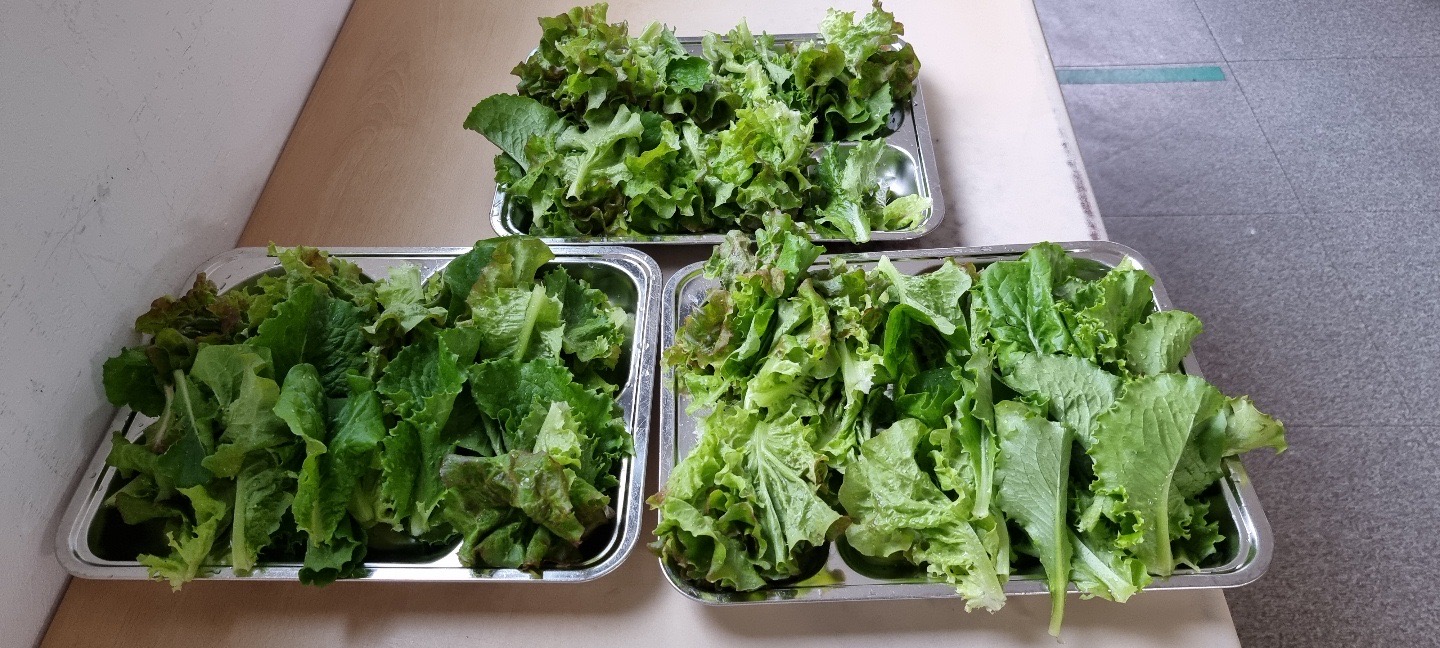 숲사랑청소년단 학생들은 각 반 텃밭상자를 추첨 받고 직접 흙과 거름을 섞었다. 6일 후인 6월 1일에는 상추, 깻잎, 가지, 오이, 고추, 수박, 방울토마토 등 다양한 작물들을 심어 보았다. 숲사랑청소년단 임원들은 매일 등교 후, 하교 전 텃밭에 물을 주었고, 6월 15일 상추 첫 수확을 할 수 있게 되었다. 첫 상추 수확 / 지도교사 송춘종