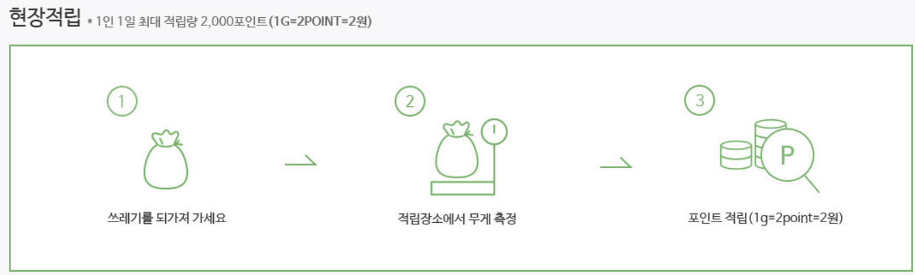 ■ 현장적립 쓰레기를 적립장소에 가져가서 무게를 측정하고 1g당 2포인트를 받습니다.