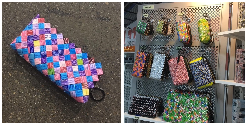 ♣과자 봉지를 활용한 가방 과자봉지는 투명하게 잘라 기름기나 염분을 잘 닦고 말려서 버려야만 재활용이 가능합니다. 게다가 3중지 이상의 플라스틱 소재들이 접합되어 있어 재활용이 어렵습니다. 하지만 ‘저스트 프로젝트’에서는 이런 과자봉지의 특성을 창의적으로 살려 가방이나 필통, 파우치, 러그 등을 만들었습니다. 이렇게 과자봉지로 만들어진 물건들은 생각보다 두껍고 튼튼해서 전자기기를 넣어도 완충이 되고 생활방수도 된다고 합니다. 또 만들어진 물건들은 소비나 생산이 과잉 상태인 시대에서 버려지는 것들이 훌륭한 소재가 될 수 있다는 것을 보여줍니다.