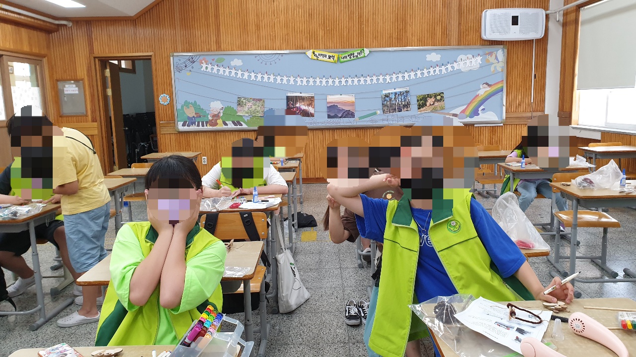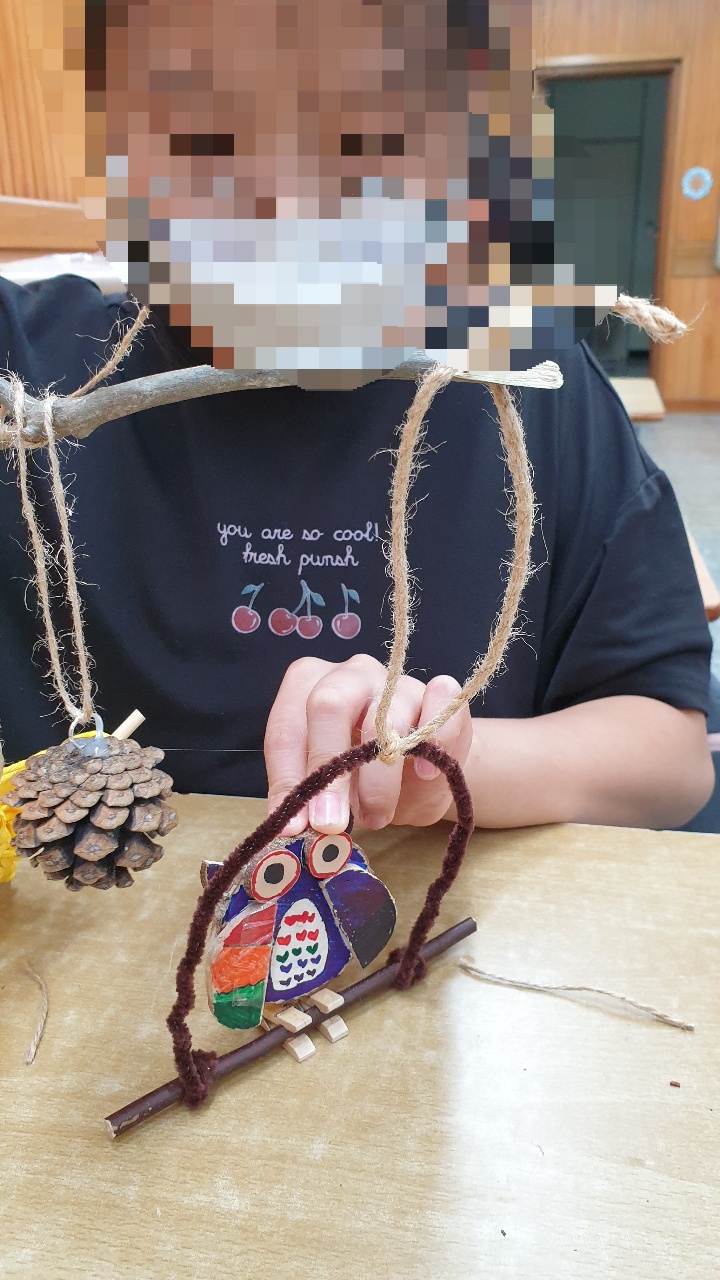 7월 21일 구평남부초등학교 숲사랑대원들은 나무를 이용하여 부엉이 모빌을 만들었습니다. 부엉이 모빌을 만들 때 나무를 부엉이 형태로 만든 후 색칠하여 꾸몄습니다.