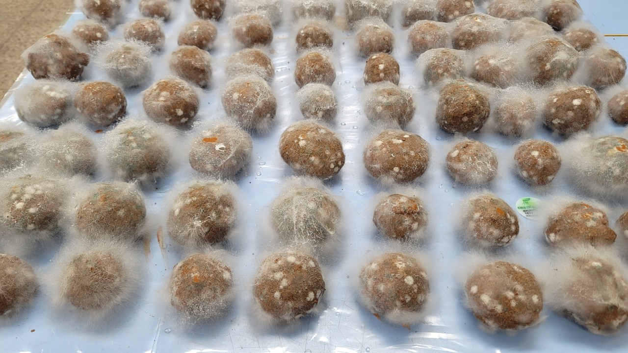 EM 흙공을 만드는 방법은 황토 10kg + EM 활성액 또는 쌀뜨물 발효액 약 2L + EM 발효촉진제 1kg을 섞어 공 모양으로 뭉쳤을 떄 잘 뭉쳐진다면 잘 만든 것입니다.! 다 만들었다면 어두운 곳에서 약 1~2주 정도 발효를 시켜주면 완성입니다 :) 사진에서 볼 수 있는 것처럼 흙공에 생기는 흰색 곰팡이는 방선균이나 사상균의 일종입니다.