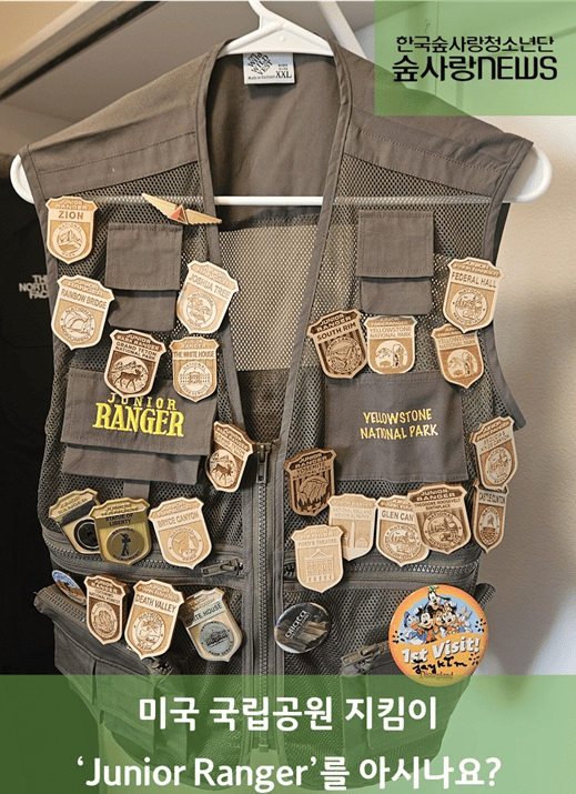 한국과 마찬가지로 전 세계국가들은 자연환경과 산림을 보호하기 위해서 다양한 제도를 운영하고 있습니다. 특히, 미국은 국립공원 보호를 아주 중요하게 생각하고 있는데요, 미국 국립공원청(NPS)이 운영하는 '주니어 레인저'는 어린이와 가족이 국립공원을 더 재미있고 깊이 있게 이해할 수 있도록 돕는 체험 학습 프로그램입니다. 참여자는 활동지를 받아 퍼즐, 자연관찰, 퀴즈, 스토리텔링 같은 미션을 수행하고 레인저에게 제출하면, 주니어 레인저 배지나 패치, 증명서를 받을 수 있습니다.