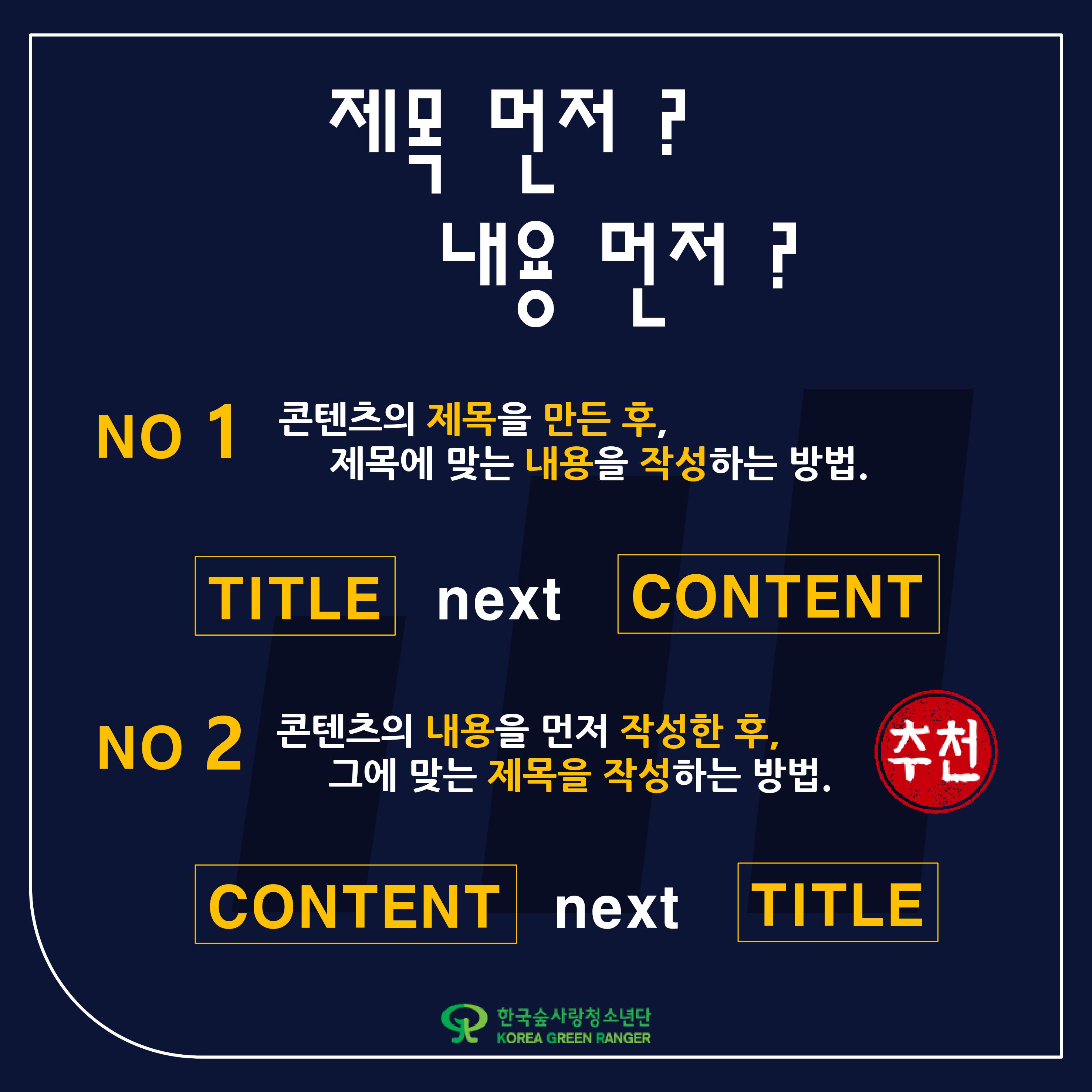 포스트를 작성하실 때에는 ① 콘텐츠의 제목을 만든 후, 제목에 맞는 내용을 작성하는 방법과 ② 콘텐츠의 내용을 먼저 작성한 후 그에 맞는 제목을 작성하는 방법이 있는데요.