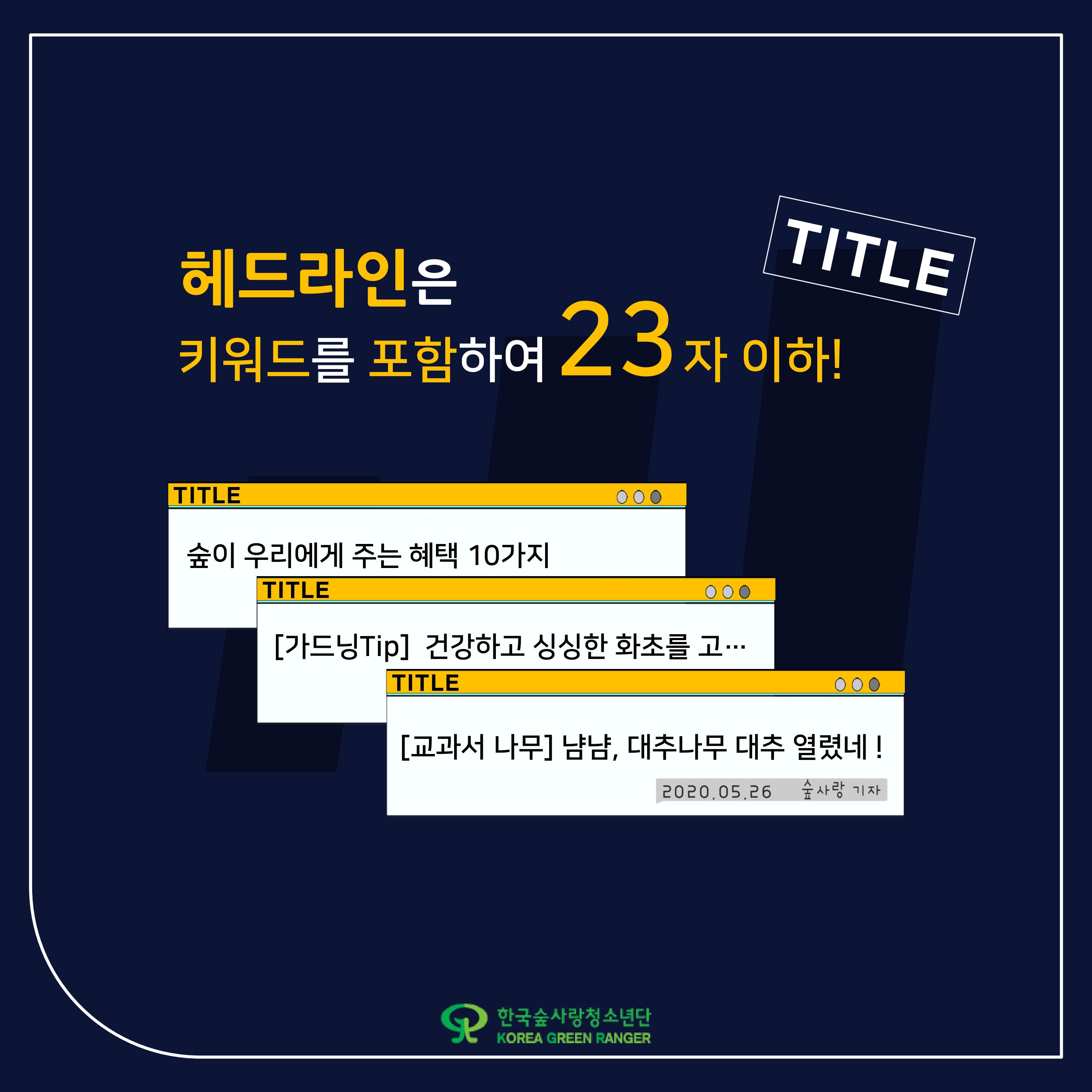 헤드라인은 키워드를 포함하여 30자 이내로 짧게 써주세요. 한국숲사랑청소년단 포유 어플에서는 30자가 넘어가게 되면 헤드라인이 중간에 잘리게 됩니다.
