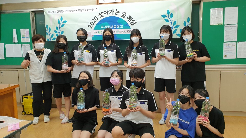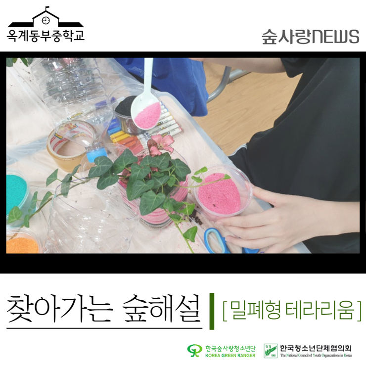 8월 10일 옥계동부중학교에서 '찾아가는 숲 해설' 프로그램이 열렸다. 한국숲사랑청소년단 대원들뿐만 아니라 숲에 관심이 있는 학생들도 함께 모여 숲에 대해 알아보는 시간을 가져서 더욱 뜻깊었던 시간이 되었다. 학생들은 밀폐형 테라리움을 만들고 풀잎으로 식물에 대해 알아보는 등의 다양한 활동을 통해 숲에 대해 더 자세히 알 수 있었다.