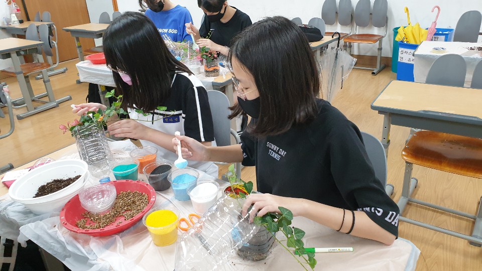 학생들은 밀폐형 테라리움에 대해 알아보고 생수 페트병으로 직접 밀폐형 테라리움 화분을 만들어보는 활동을 가졌다. 이렇게 지금 이 시간에도 버려지고 있는 재활용품을 이용하여 식물을 키운다면 환경오염을 줄이는데 보탬이 될 수 있다.