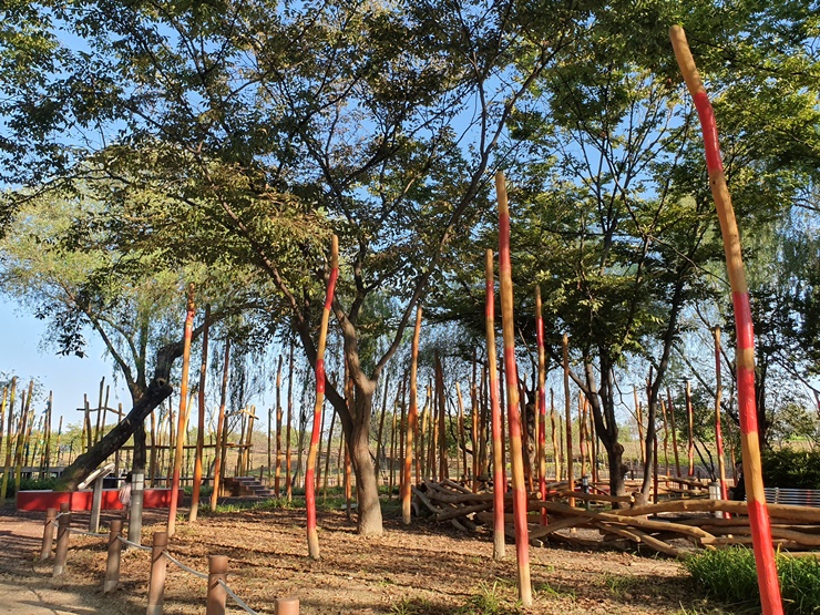 [이화정원 독서쉼터_조석현 기자] 두번째는 무지개 정원이다. 무지개정원은 아이들 놀이 위주로 구성되어 있고, 쉼터가 있다. 무지개색 출렁다리와 여러 가지 색상의 나무기둥이 있다.