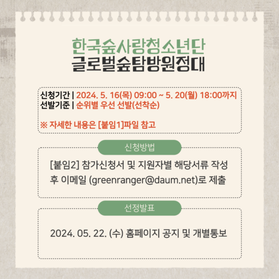 ⦁ 첨부파일 [공문] 2024 한국숲사랑청소년단 글로벌 숲탐방 원정대 참가자 모집.pdf [붙임1~5].zip