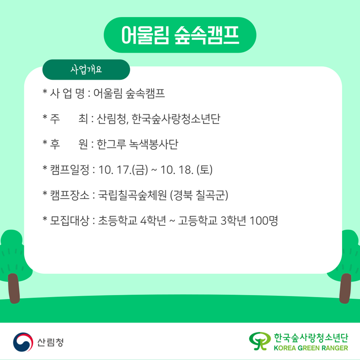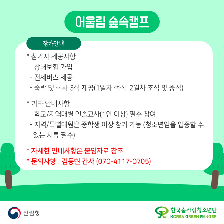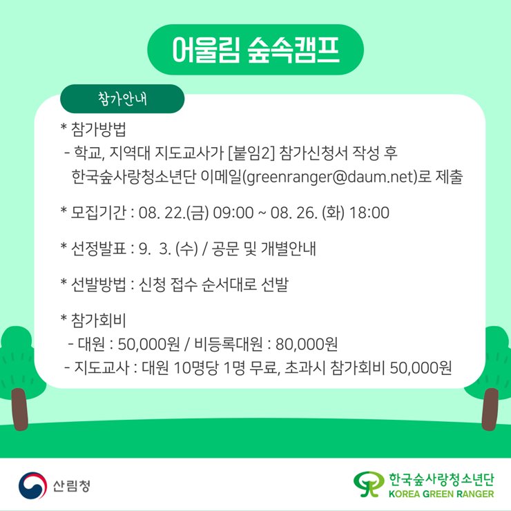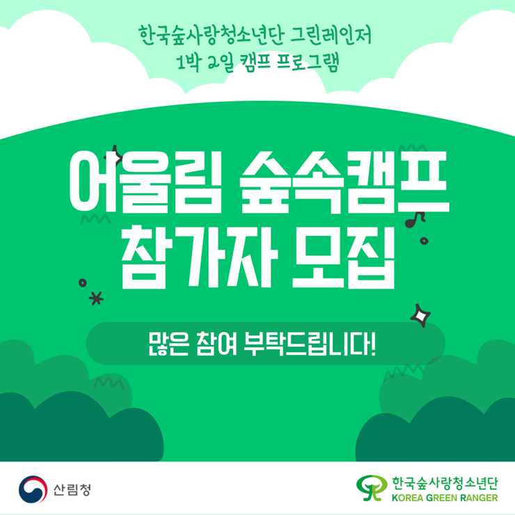 ⦁ 첨부파일 붙임1. 어울림숲속캠프 운영 계획.hwp [공문] 어울림 숲속캠프 참가학교 모집 안내.pdf 붙임2. 2025년 어울林 숲속캠프 참가신청서.hwp