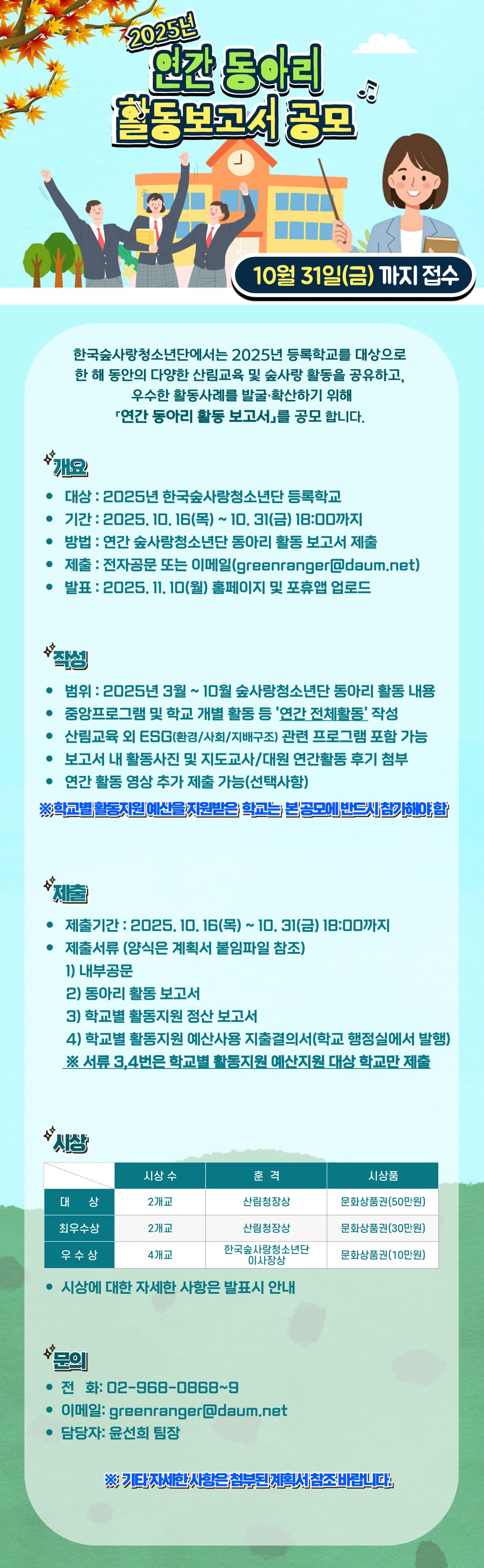 ⦁ 첨부파일 [공문] 한국숲사랑청소년단 연간활동 공모 안내.pdf [붙임] 한국숲사랑청소년단 연간 동아리 활동 보고서 공모 계획서.hwp