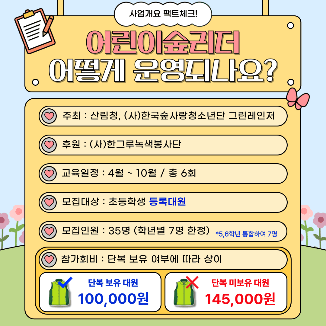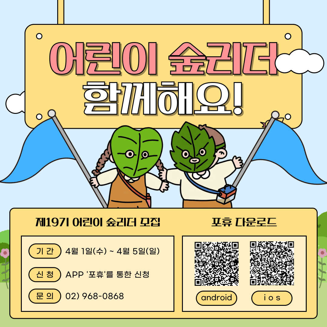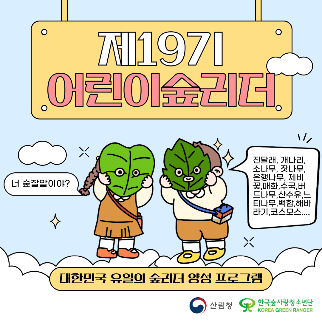 ⦁ 첨부파일 [붙임1] 제19기 어린이 숲리더 운영계획서.hwp [붙임2] 단복 구입 및 사이즈 안내사항.pdf