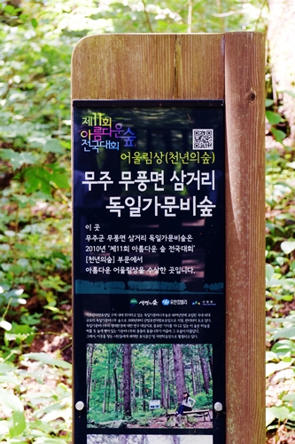 무주 무풍면 삼거리 독일가문비 숲에는 평균 26m 높이의 가문비나무 150여 그루가 장관을 이루고 나무 아래에는 층층나무가 함께 자라고 있어 아름다움을 더합니다. ‘2010년 아름다운 숲 전국대회’에서 ‘천년의 숲’ 분야 ‘어울림상’을 수상하기도 했습니다.