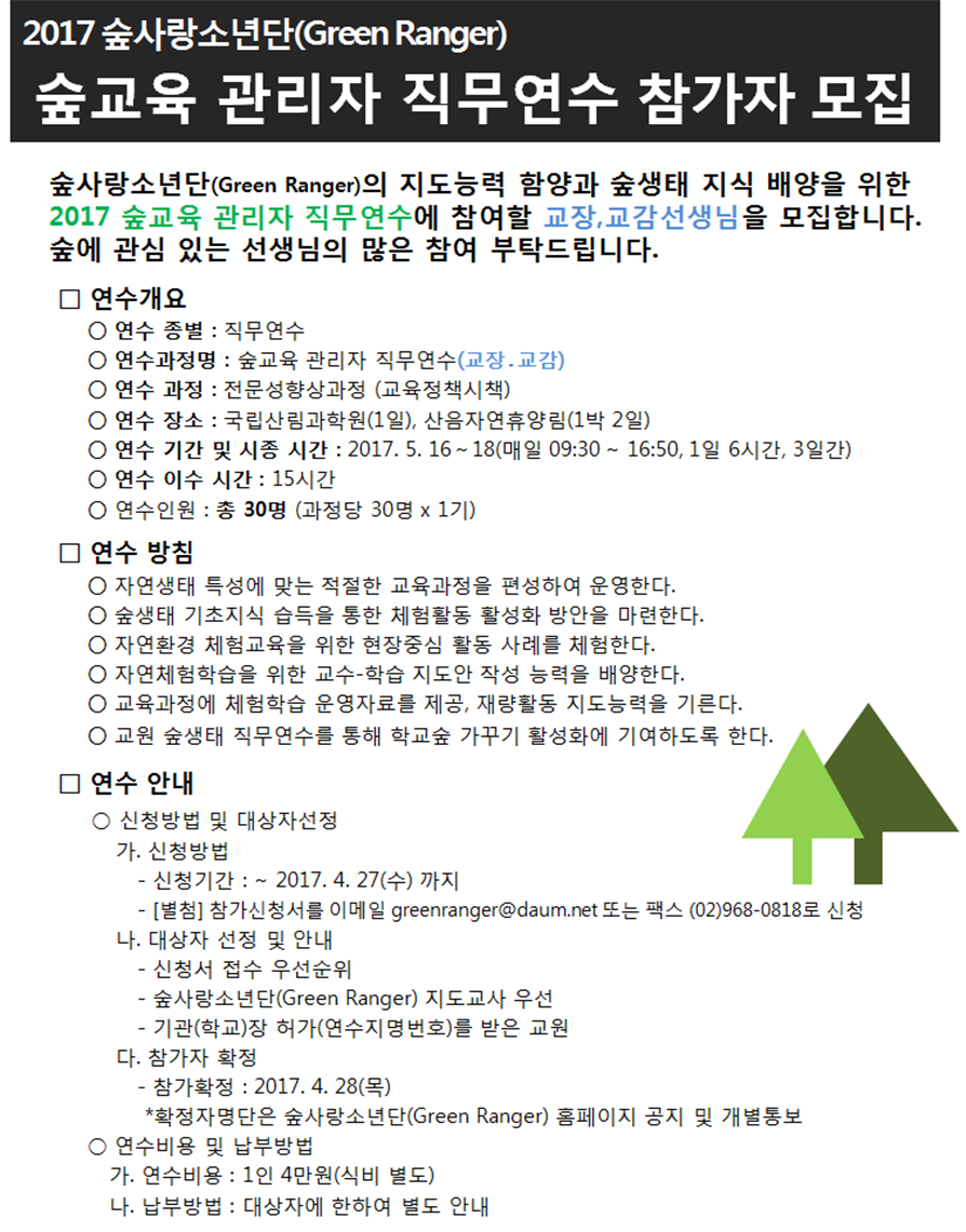⦁ 첨부파일 공문)2017 숲교육 관리자 직무연수 참가자 모집.pdf 붙임)2017 숲교육 관리자 직무연수 계획.hwp 별첨)참가신청서(관리자).hwp |