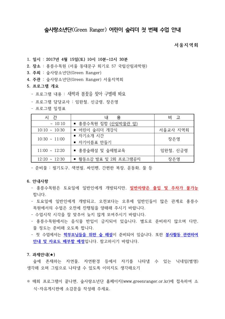 ⦁ 첨부파일 붙임1 제10기 어린이 숲리더 공지사항.hwp 붙임2 제10기 어린이 숲리더 안전지도.hwp
