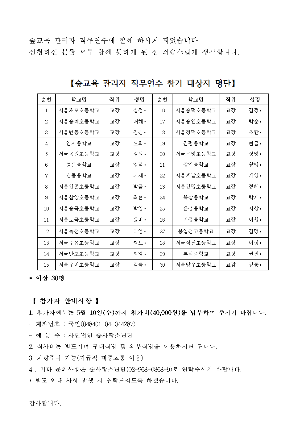 숲교육 관리자(교장,교감) 직무연수 참가자 확정 안내