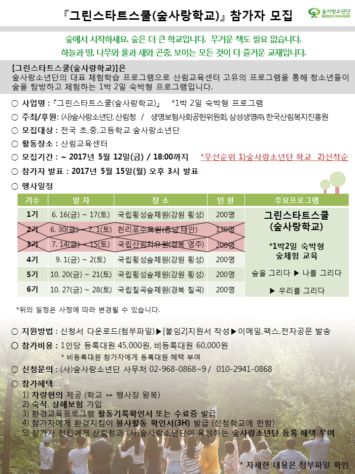 | [모집] 그린스타트스쿨(숲사랑학교) 1박 2일 숙박형 프로그램 참가자 모집 |