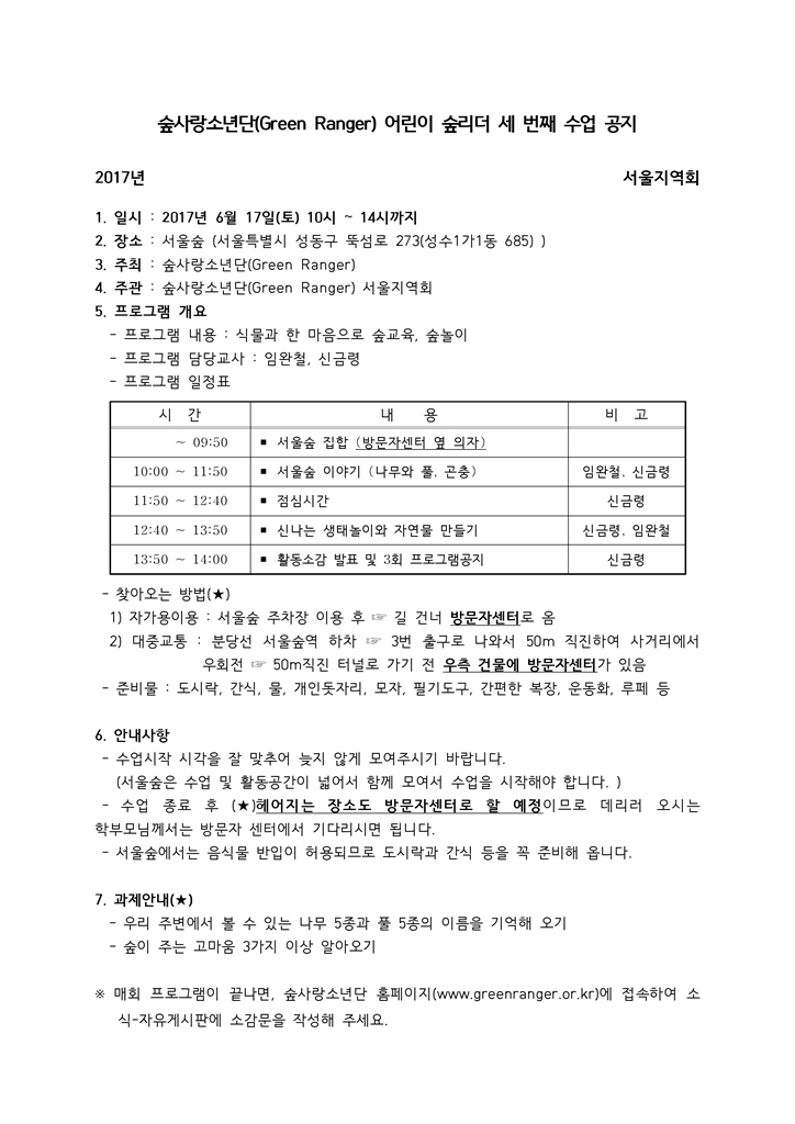 ⦁ 첨부파일 붙임1 제10기 어린이 숲리더 공지사항.hwp 붙임2 제10기 어린이 숲리더 안전지도.hwp