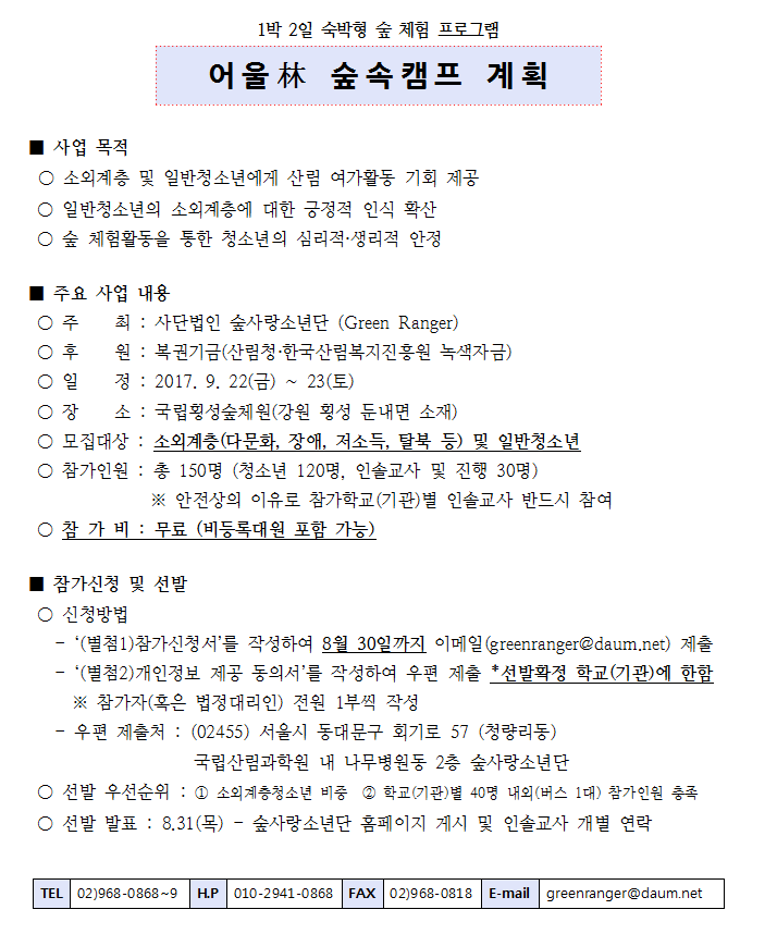 ⦁ 첨부파일 (공문)어울림 숲속캠프 참가학교(기관) 모집 안내.pdf (붙임)어울림 숲속캠프 계획서.hwp