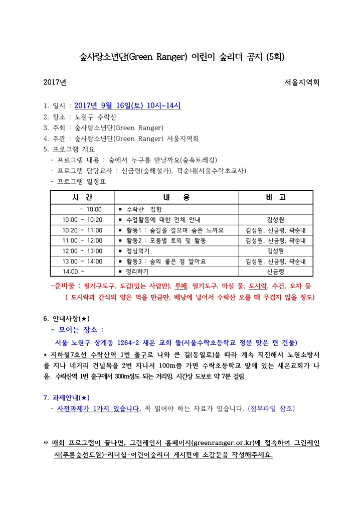 ⦁ 첨부파일 숲사랑소년단(Green Ranger) 어린이 숲리더 공지 (5회).hwp 사전과제1가지 (꼭 읽어야 하는 자료).hwp |