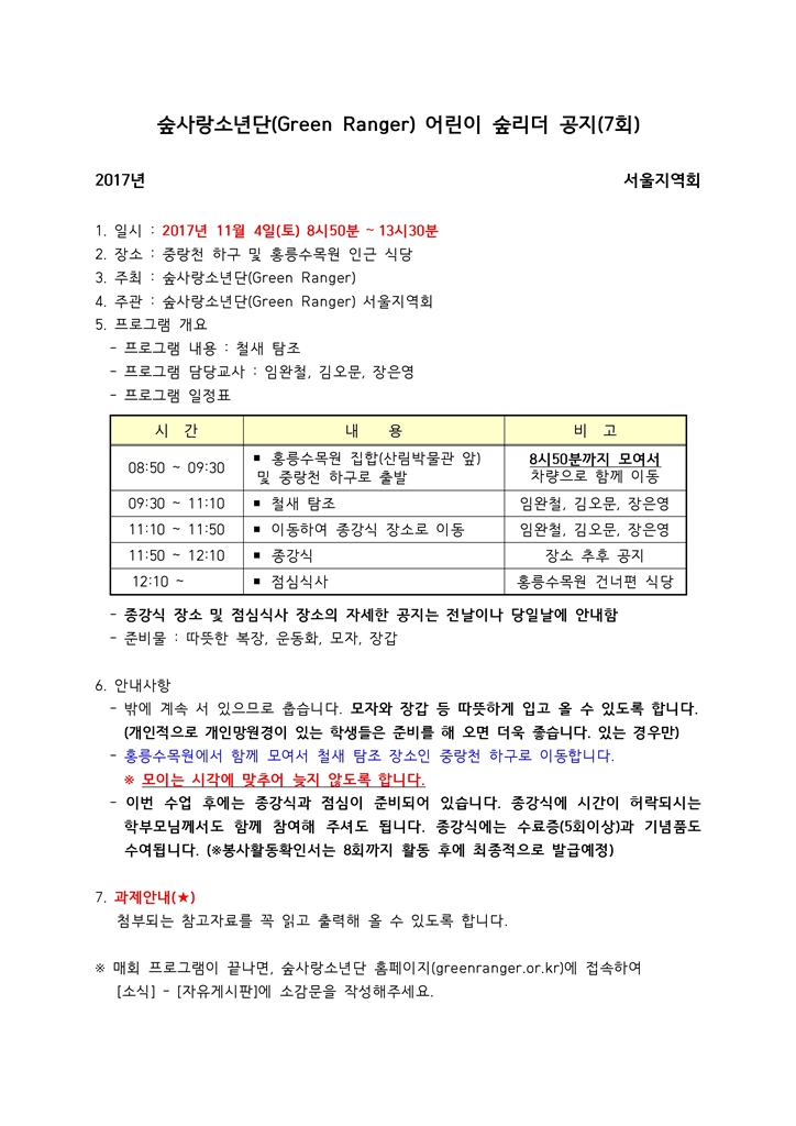 ⦁ 첨부파일 어린이 숲리더 일곱 번째 수업 공지사항.hwp 어린이 숲리더 일곱 번째 수업 참고자료.hwp 어린이 숲리더 일곱 번째 수업 안전교육.hwp