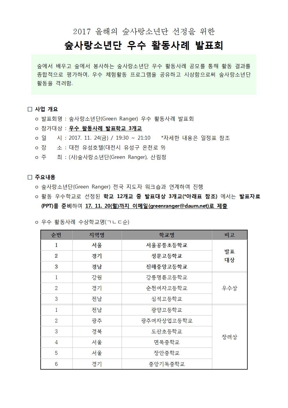 ⦁ 첨부파일 (공문)2017 숲사랑소년단 우수활동사례 학교선정 및 발표회 안내.pdf (붙임)우수활동사례 학교선정 및 발표회 안내.hwp |