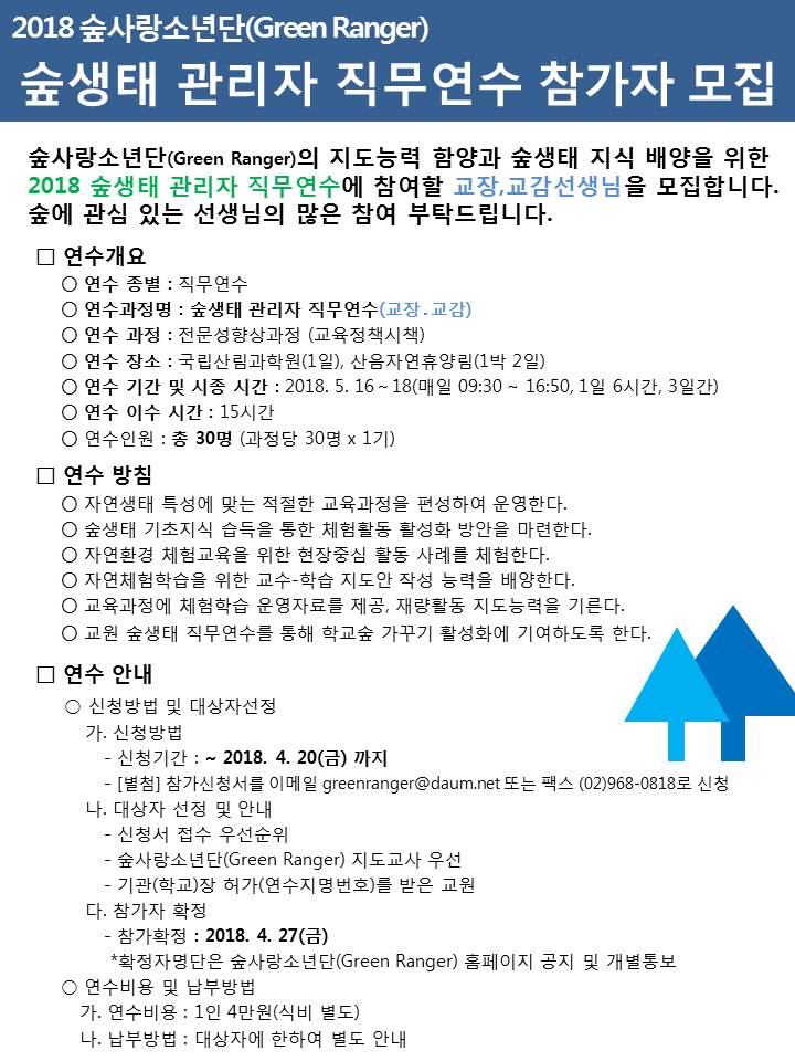⦁ 첨부파일 공문_2018 교원 숲생태 관리자(교장, 교감) 직무연수 참가자 모집 안내.pdf 붙임)2018 숲생태 관리자 직무연수 계획.hwp 별첨)참가신청서(관리자).hwp |