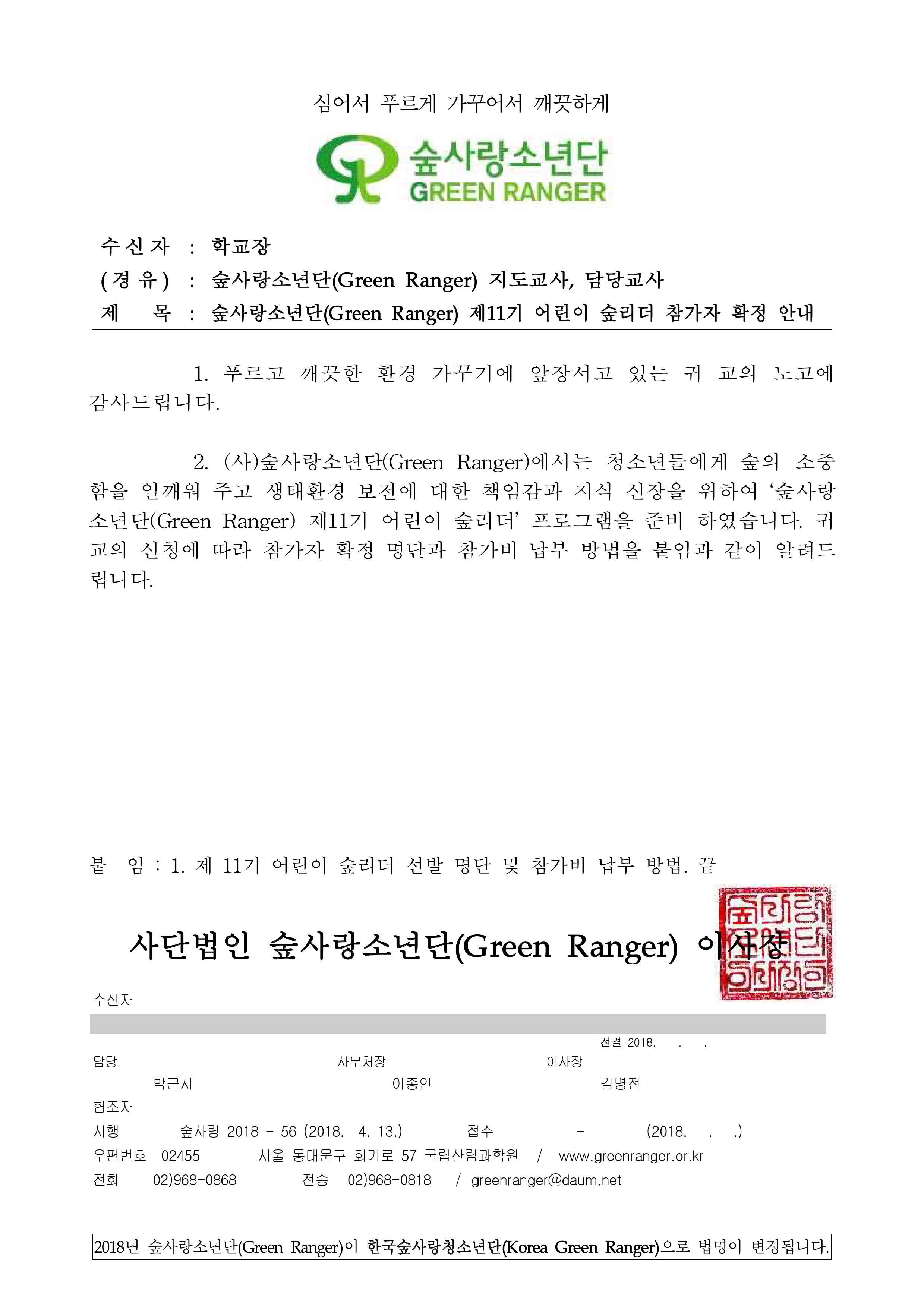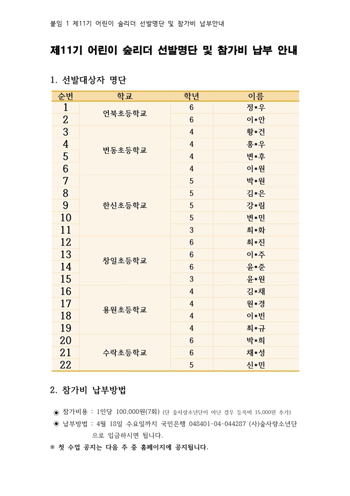 ⦁ 첨부파일 공문) 제11기 어린이 숲리더 선발명단 및 참가비 납부방법 안내.jpg 붙임1 제11기 어린이 숲리더 선발명단 및 참가비 납부방법 안내.pdf