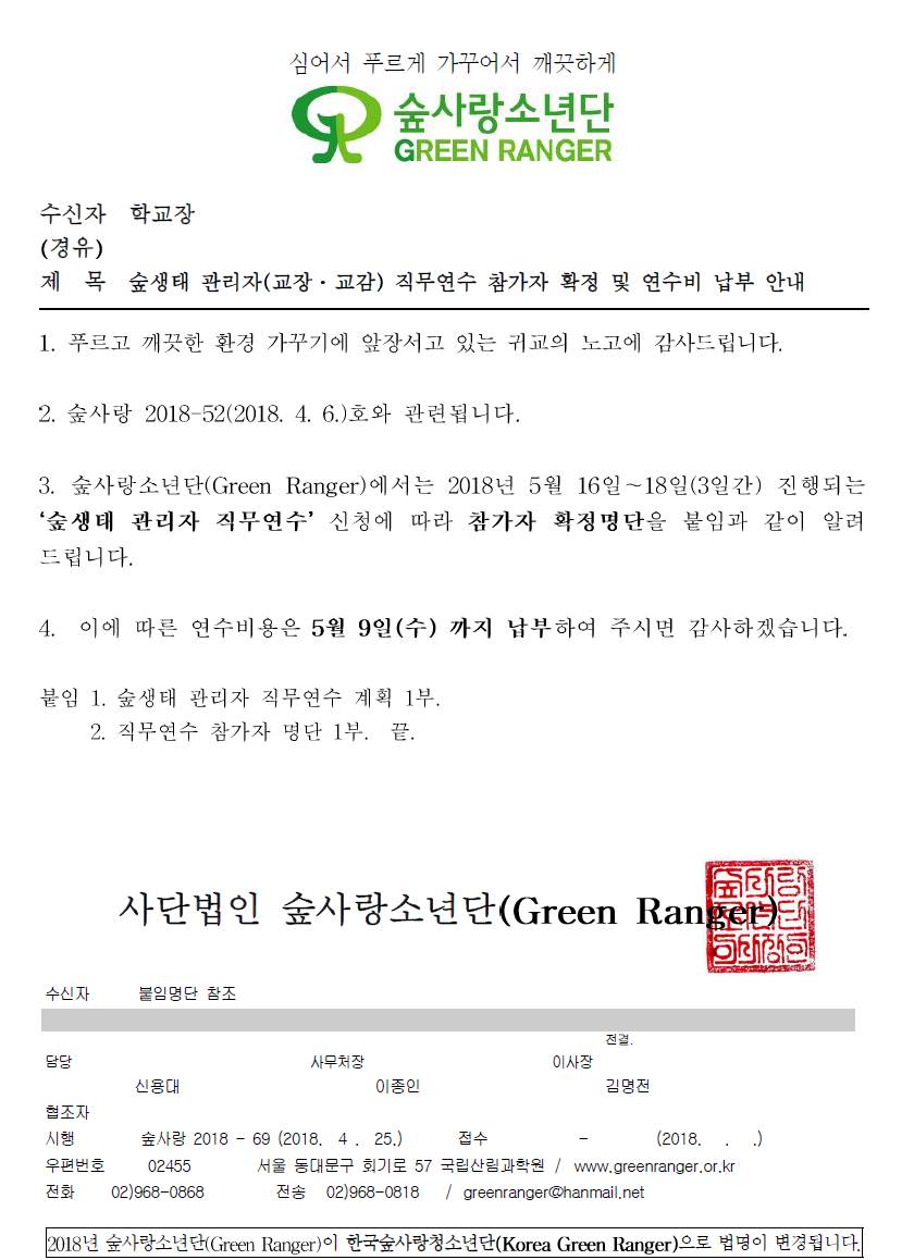⦁ 첨부파일 공문_숲생태 관리자(교장․교감) 직무연수 참가자 확정 및 연수비 납부 안내.pdf 붙임1_숲생태 관리자 직무연수 계획.hwp 붙임2_직무연수 참가자 명단.hwp |