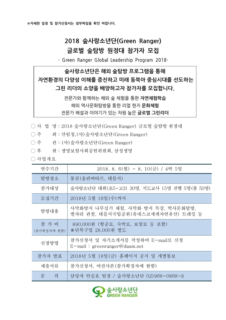 ⦁ 첨부파일 [공문]2018 숲사랑소년단 글로벌 숲탐방 원정대 참가자 모집.pdf [붙임1]2018글로벌숲탐방원정대계획.hwp [붙임2] 참가신청서.hwp |