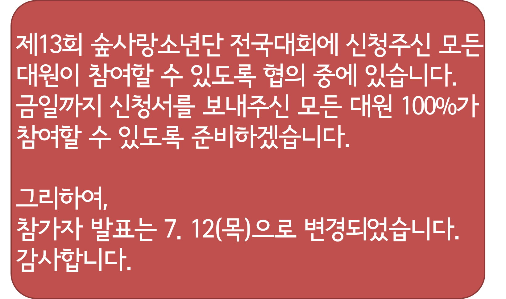⦁ 첨부파일 공문_제13회 숲사랑소년단 전국대회 참가교 모집.pdf 붙임_제13회 숲사랑소년단 전국대회 계획 및 참가신청서.zip |
