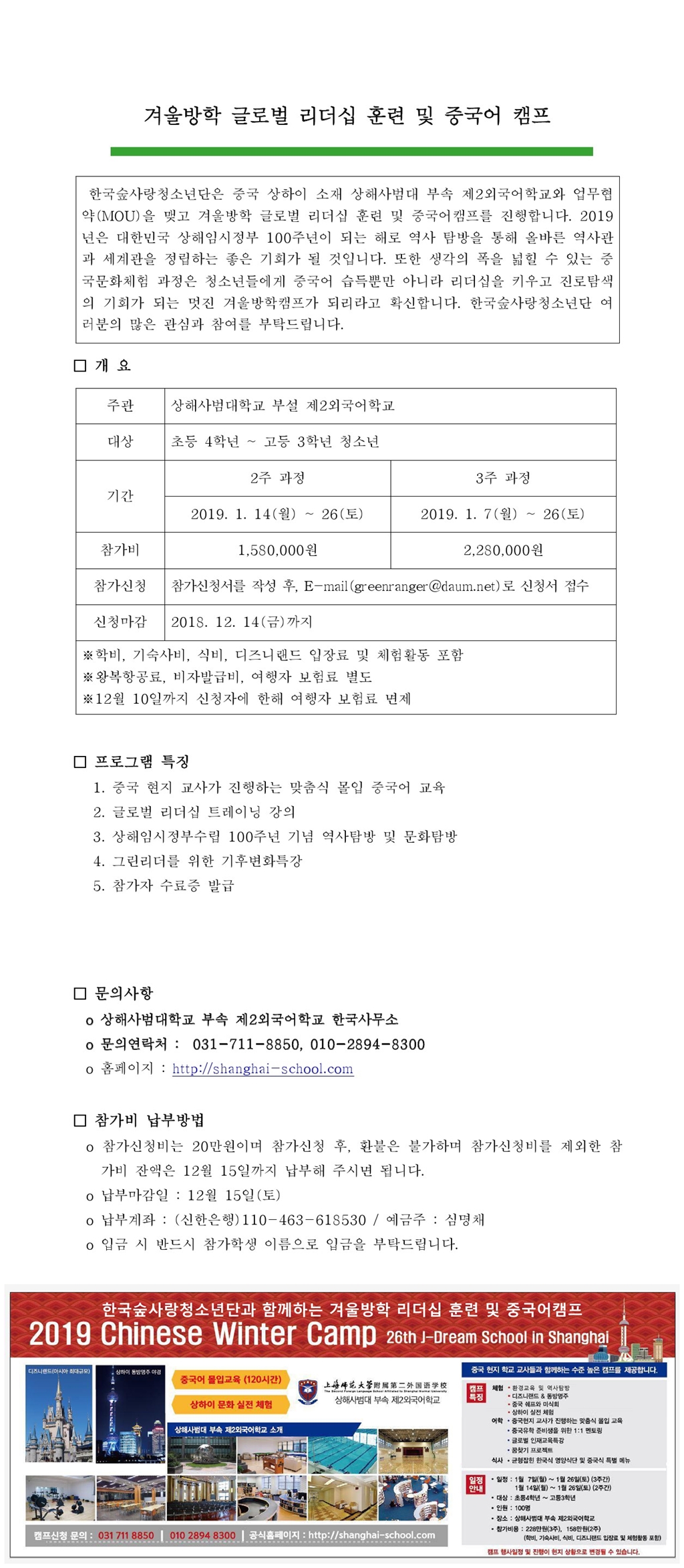 ⦁ 첨부파일 [공문]겨울방학 글로벌 리더십 훈련 및 중국어캠프 참가자 모집 안내.pdf [붙임]한국숲사랑청소년단 겨울방학 중국어캠프 계획.hwp |