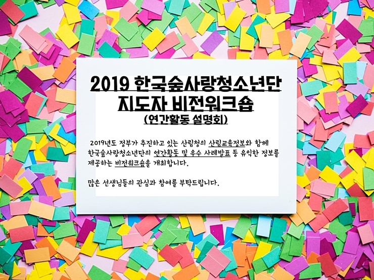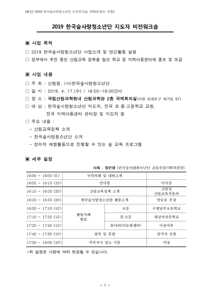 ⦁ 첨부파일 공문 한국숲사랑청소년단(학교장).pdf 공문 한국숲사랑청소년단(센터장).pdf (붙임) 2019 한국숲사랑청소년단 비전워크숍 계획(신청서포함 최종).hwp