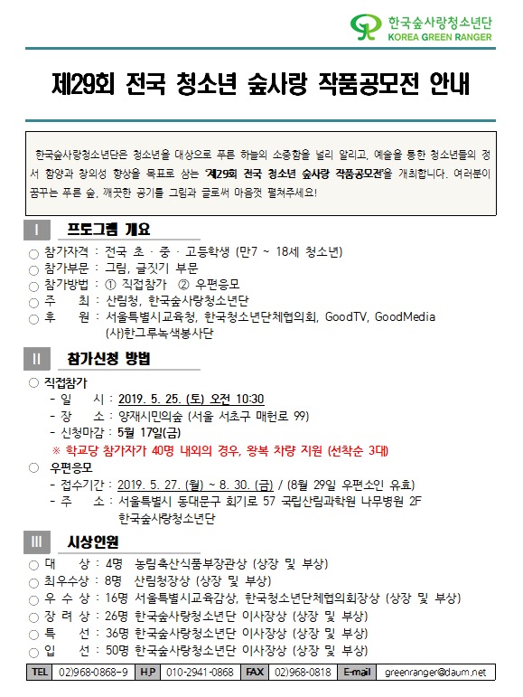 ⦁ 첨부파일 [공문]제29회 전국 청소년 숲사랑 작품공모전 안내.pdf [붙임1]제29회 전국 청소년 숲사랑 작품공모전 계획.hwp [붙임2]참가신청서(우편응모용).hwp