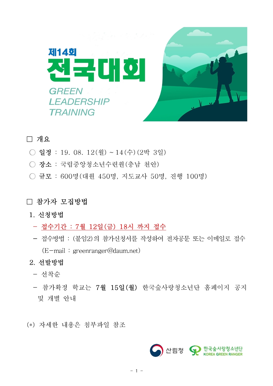 ⦁ 첨부파일 [공문]제14회 한국숲사랑청소년단 전국대회 참가자 모집.pdf [붙임1]제14회 전국대회 계획서.hwp [붙임2-3]신청서.zip |
