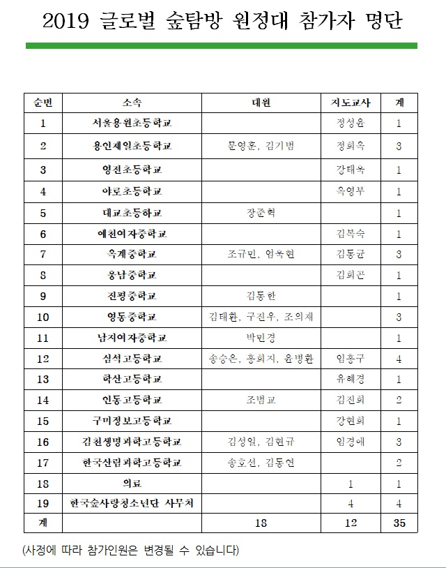 | [확정] 2019 글로벌 숲탐방 원정대 참가확정 안내 |