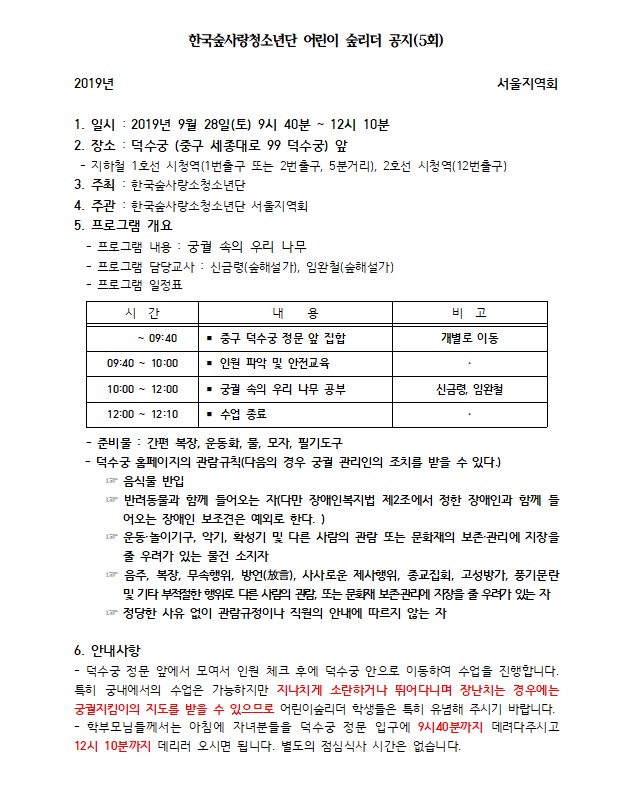 ⦁ 첨부파일 붙임1)9.28_어린이숲리더 공지사항.hwp 붙임2)9.28_어린이숲리더 안전교육자료.hwp 붙임3)9.28_우리궁궐의 나무알기(덕수궁).hwp