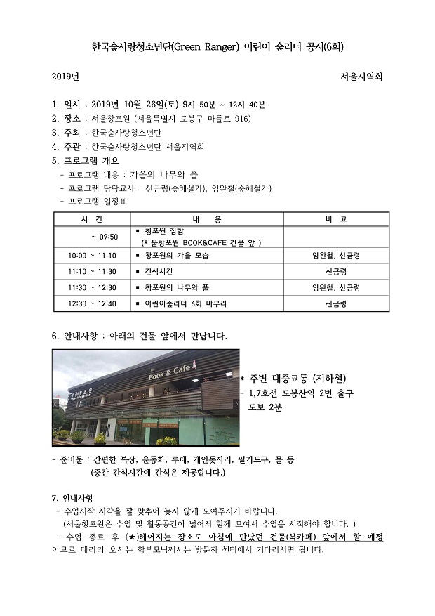 ⦁ 첨부파일 붙임1)10.26_어린이숲리더 공지사항.hwp 붙임2)10.26_어린이숲리더 안전지도자료.hwp 붙임3)10.26_어린이숲리더 활동지.hwp