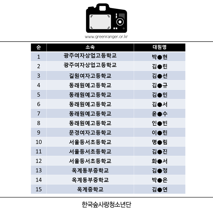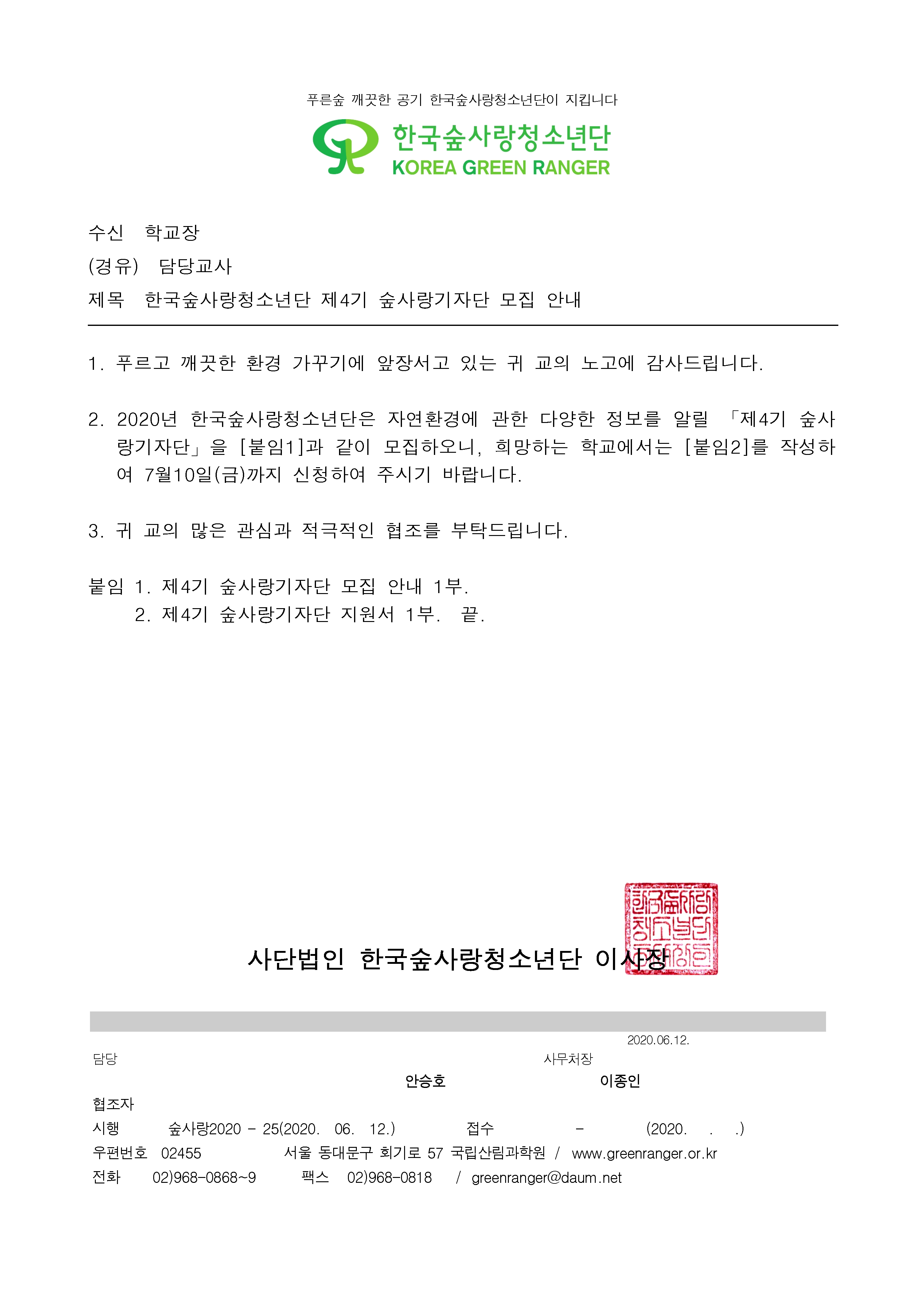 ⦁ 첨부파일 [공문] 한국숲사랑청소년단 제4기 숲사랑기자단 모집 안내.png [붙임1]제4기 숲사랑기자단 모집 안내.hwp [붙임2](지원자명)_숲사랑기자단 지원서.hwp