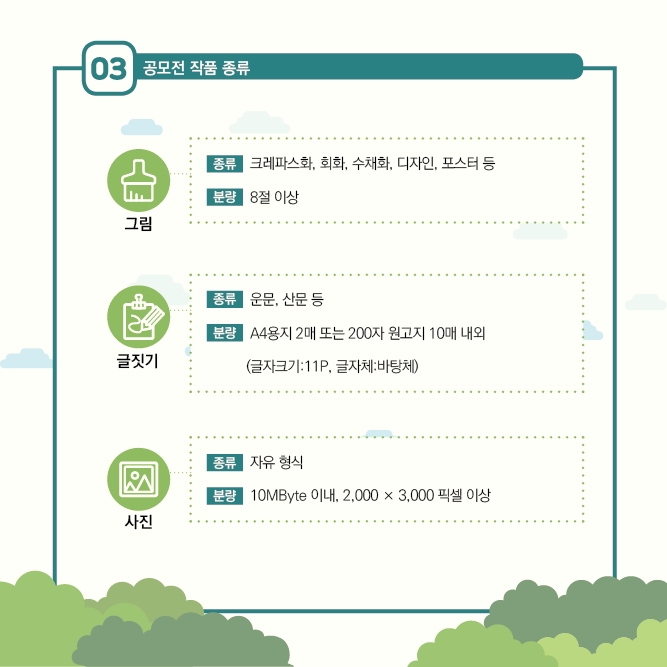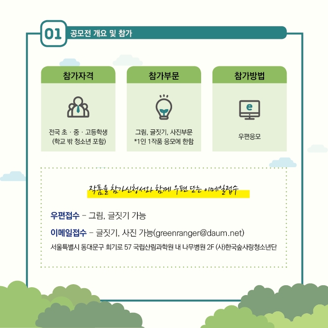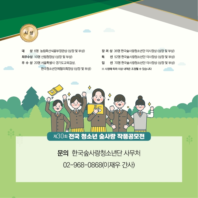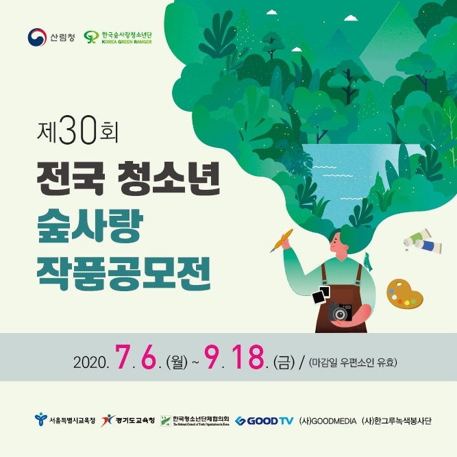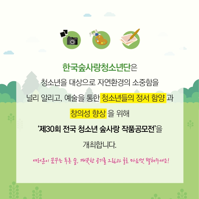 ⦁ 첨부파일 [공문]제30회 전국 청소년 숲사랑 작품공모전 개최 안내.pdf [붙임1]제30회 전국 청소년 숲사랑 작품공모전 계획.hwp [붙임2]참가신청서.hwp